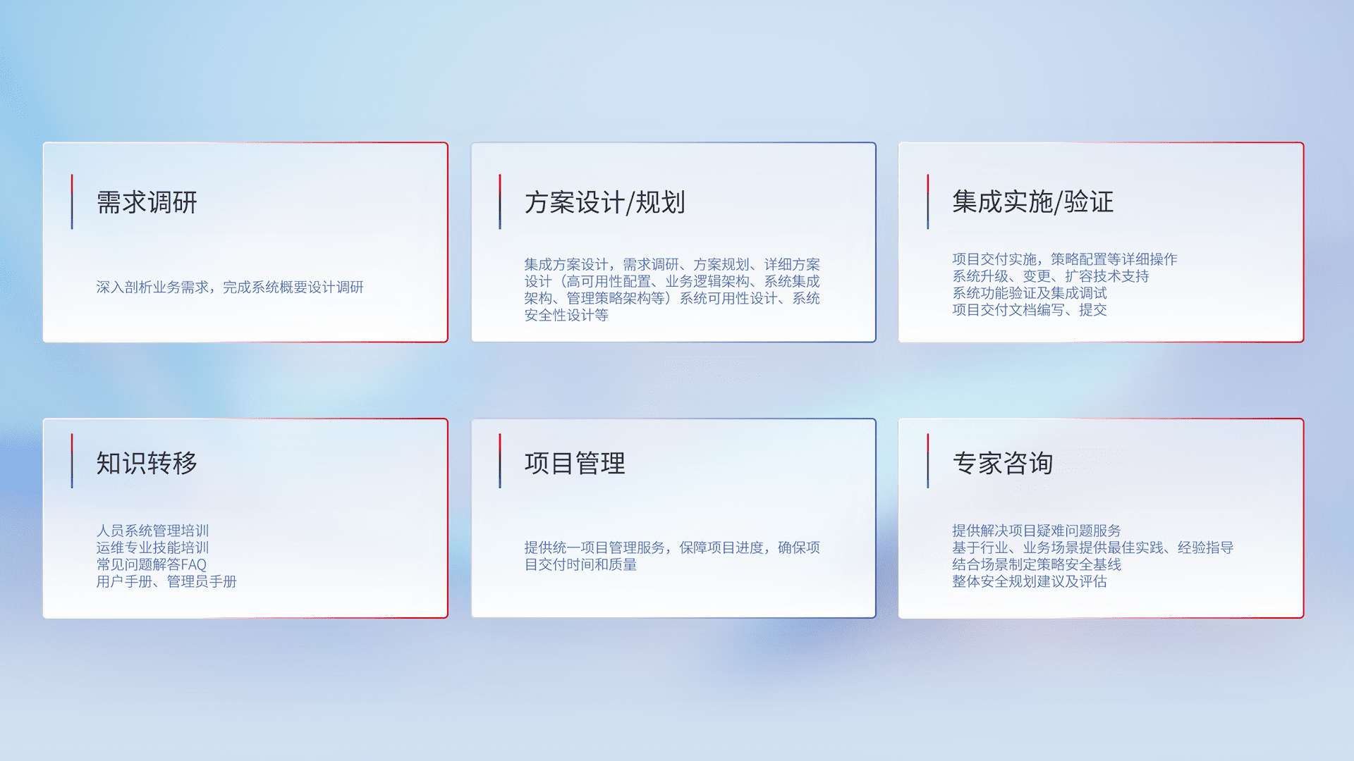 针对客户行业特性,,,将宏观的安全战略和需求,,,,通过专业的交付服务,,实现项目落地,,为客户提供标准规范的集成交付服务。。。。